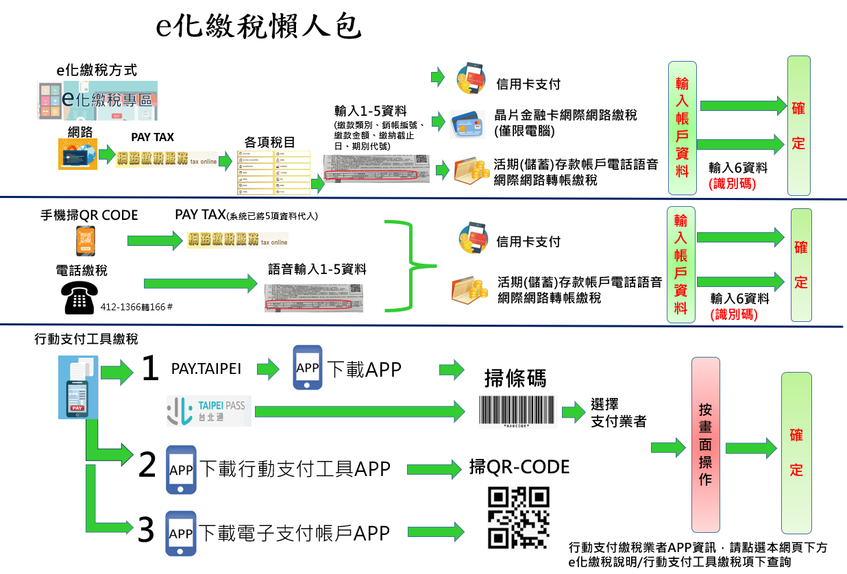 (一)透過下載支援本市智慧支付平台(PAY.TAIPEI)繳稅業者APP或台北通APP,掃描繳款書上三段式條碼繳稅。