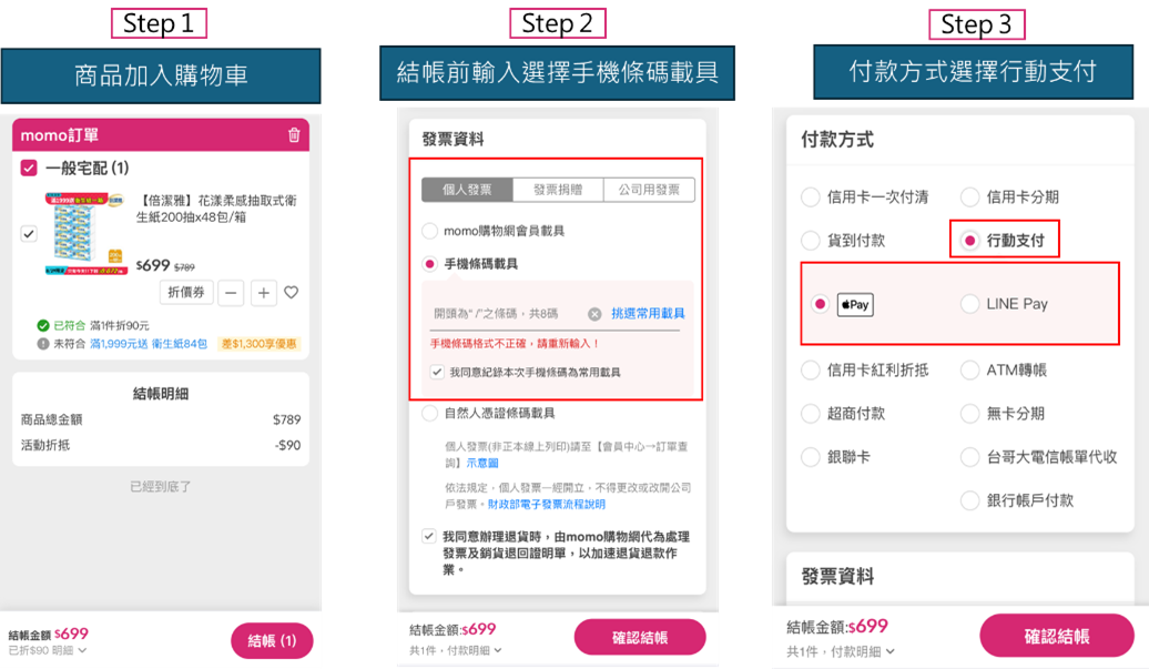 (二)活動期間以momo購物網或APP綁定手機條碼,並消費以行動支付儲存雲端發票乙次。